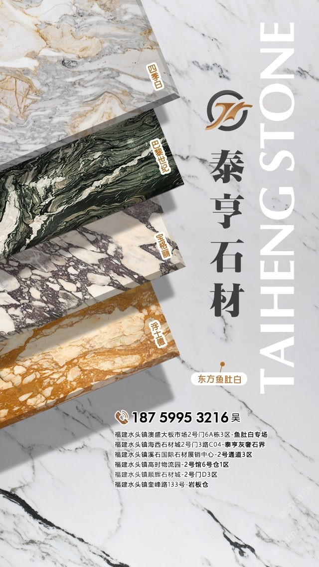 泉州泰亨石材有限公司,辦公地點位于中國石材之都—南安水頭。經(jīng)營產(chǎn)品有:東方魚肚白(自有礦山),四季白,巴黎世紀,寶格麗,浮士德,布達拉灰(自有礦山),星空灰(自有礦山)、雅蘭云天(包礦)、蘋果灰(包礦)、銀鉆咖啡(包礦)、魚肚白、雪花白、藍金沙白金沙系列、帕斯高灰、意大利木紋、意大利,西班牙原裝進口巖板(中國總代理)、國產(chǎn)巖板(福建總代理)、黃斑石、意大利木紋、銀鉆咖啡,魚肚灰等優(yōu)質(zhì)品種。我們以經(jīng)驗豐富的采購團隊,熱情專業(yè)的銷售團隊和執(zhí)著細致的技術(shù)團隊,為客戶提供精致的產(chǎn)品,售前售后服務(wù)和技術(shù)支持。本著為客戶負責(zé)的態(tài)度,經(jīng)過多年的潛心經(jīng)營,泰亨石材在石材業(yè)界樹立了良好的信譽。如果您對我司的產(chǎn)品服務(wù)有興趣,歡迎在線留言或來電來函咨詢,泰亨石材在追求美的路上與您一路同行。