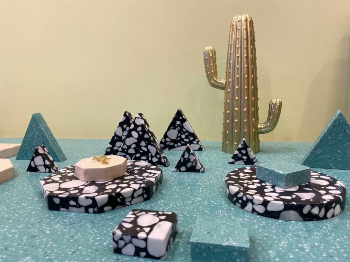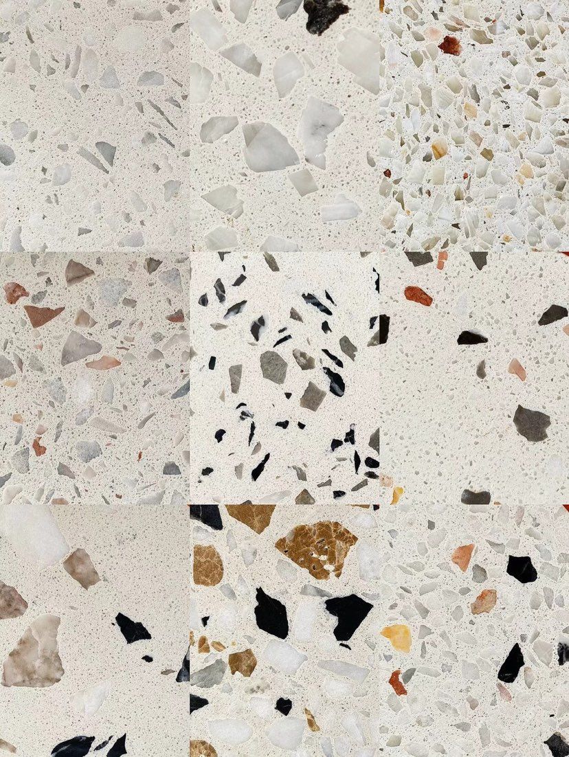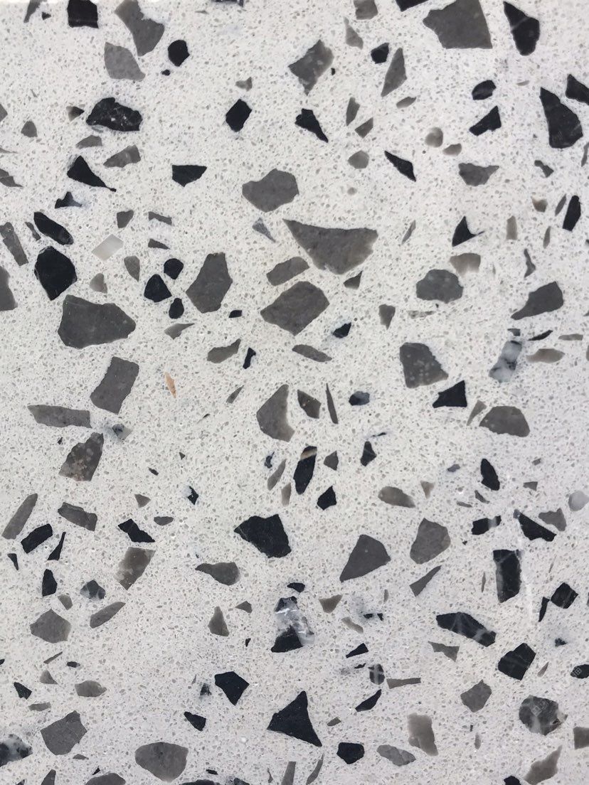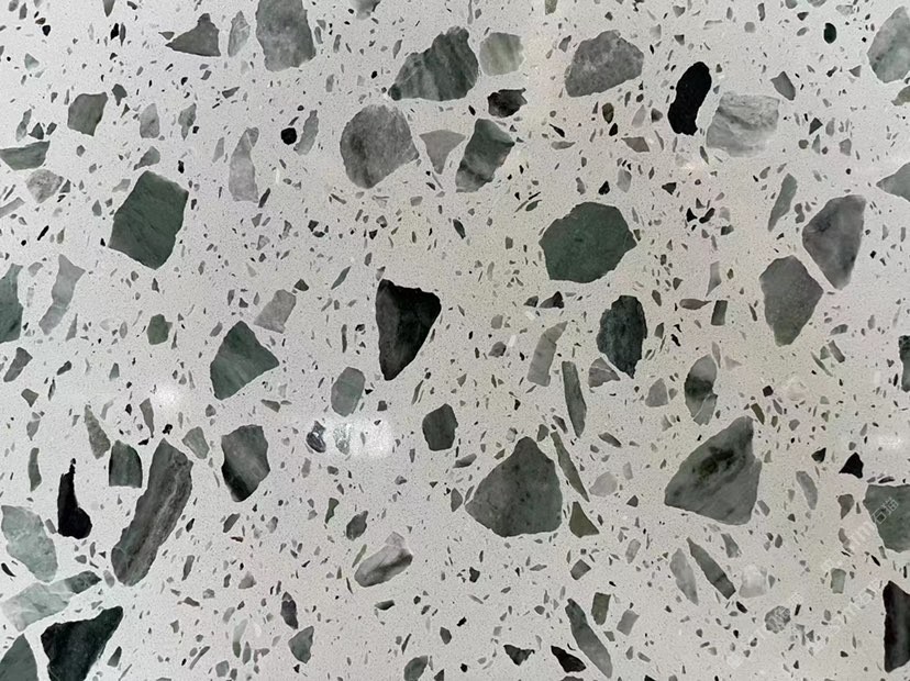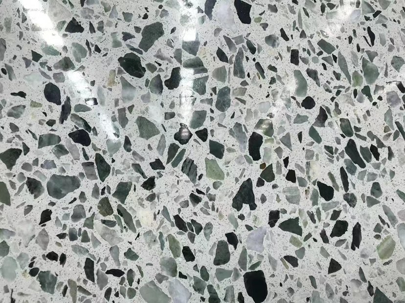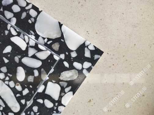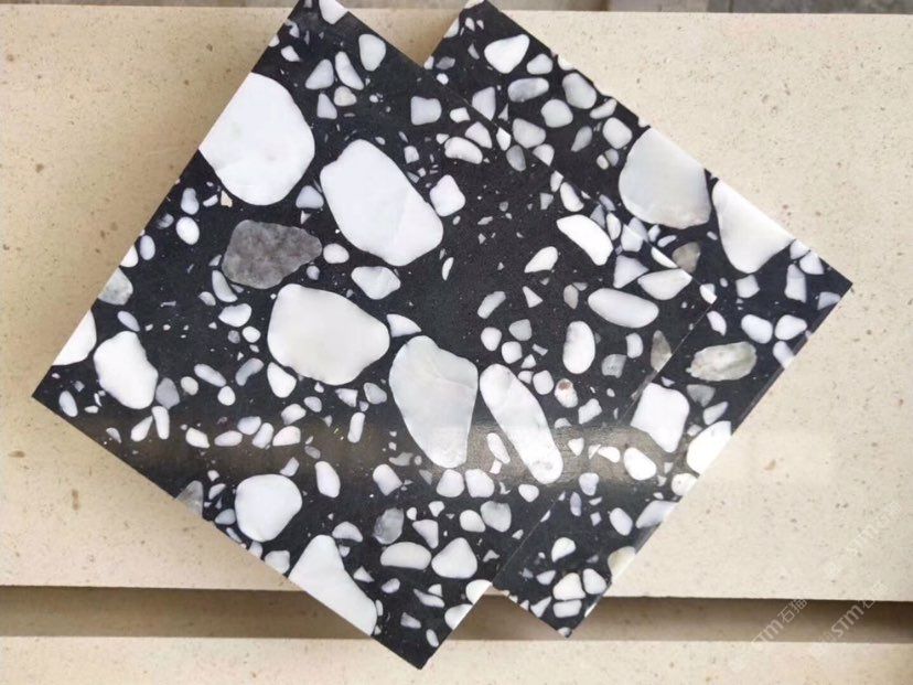 人造無機水磨石,生產(chǎn)主要原材料,天然礦石沙,高標號白水泥和水,經(jīng)過先進制作工藝流程壓制成型荒料,再根據(jù)工程設(shè)計厚薄規(guī)格切割成大板。