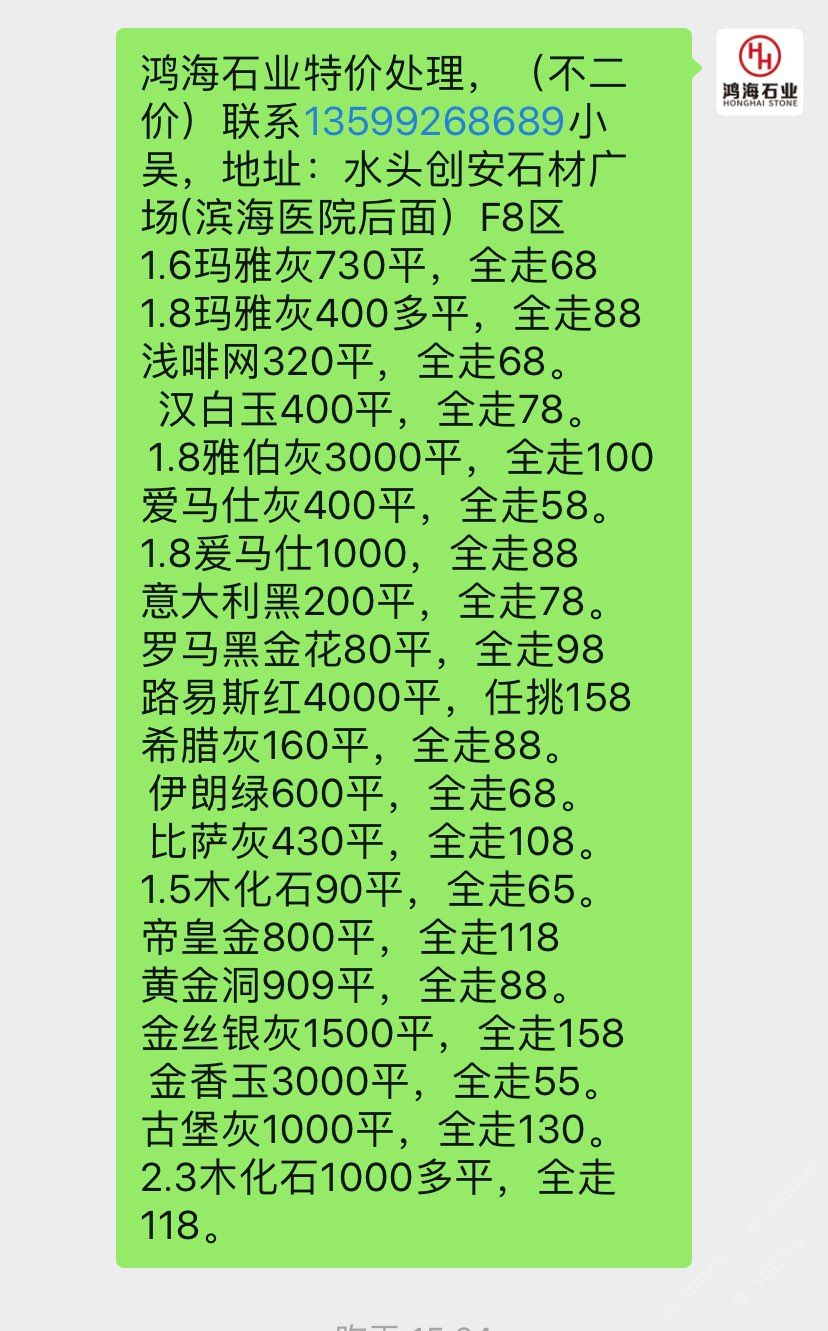 鴻海石業(yè)-現(xiàn)板5萬平特價(jià)處理,(不二價(jià))聯(lián)系13599268689小吳,地址:水頭創(chuàng)安石材廣場(chǎng)(濱海醫(yī)院后面)F8區(qū) 1.8絲綢白3000平,150起 1.8金絲銀灰7500平,100起1.8夢(mèng)幻藍(lán)4500平,100起。1.8卡拉垃白一150元起。 1.8藍(lán)色星球1300平,150起水墨年華6000平全走78。 1.8午夜星河1300平,150起1.8多蘭戈(紅色)300平,柏斯高灰2000平,全走88 新瑪雅灰3500平,全走88 1.5瑪雅灰200多平,全走68 星塵灰400平,全走88。 愛馬仕灰7500平,全走78 羅馬黑金花60平,全走88 黃金洞909平,全走88。 金香玉300平,全走50。 古堡灰1000平,全走99。 云海灰900多平全走128。2.3木化石100平,全走128。
