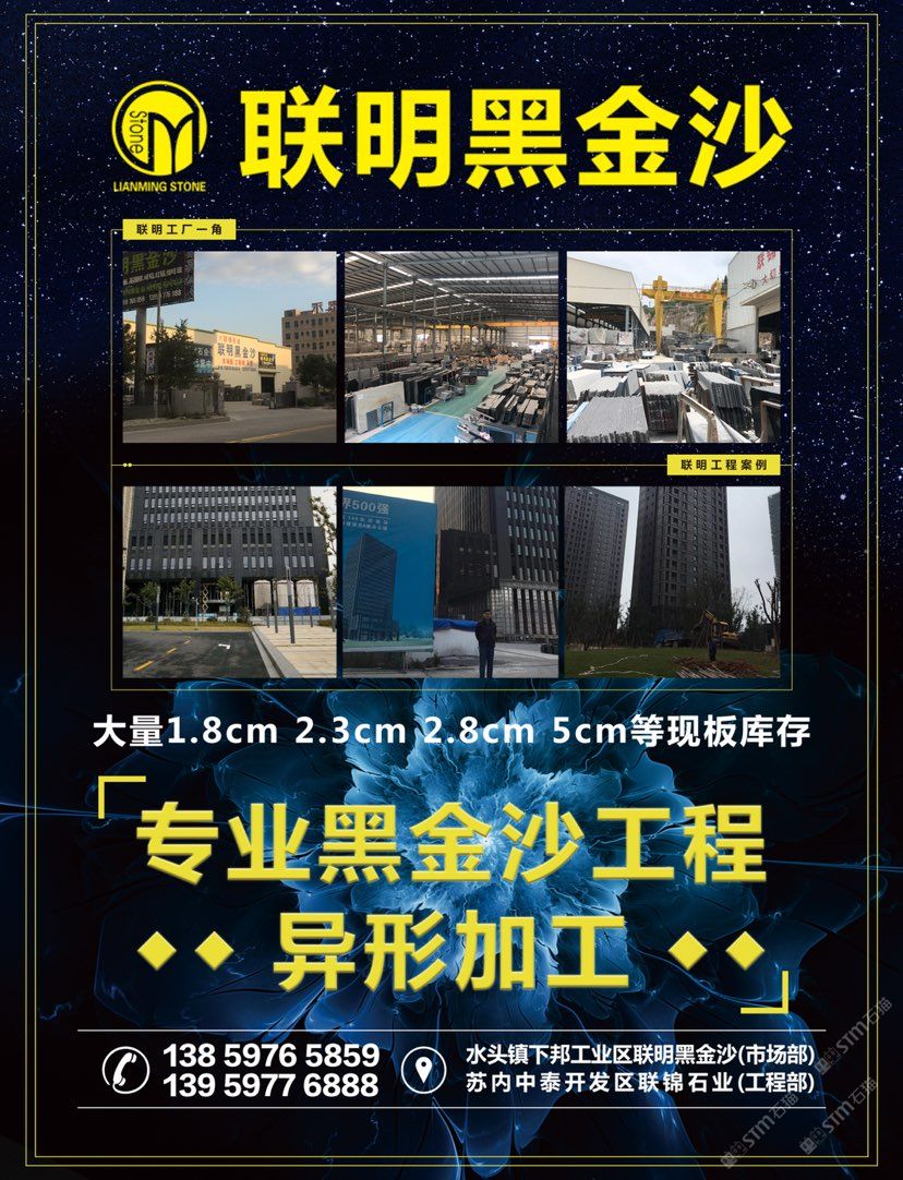 【聯(lián)明?黑金沙】——大工廠的規(guī)模和質(zhì)量,小廠的價格。兩工廠共占地35左右畝地,一廠為市場部位于水頭鎮(zhèn)下邦工業(yè)區(qū),二廠為工程運營中心位于石井中泰集控區(qū),是一家集礦山、生產(chǎn)、加工為一體化的綜合性專業(yè)化石材工廠,有著十幾年的黑金沙經(jīng)驗,公司主要經(jīng)營黑金沙市場板,工程板,黑金沙異型加工。工程案例有:1、上海楊浦區(qū)149項目中船大廈,黑金沙總用量3萬平方;2、蒼南天和家園共3期,黑金沙總用量5萬平方;