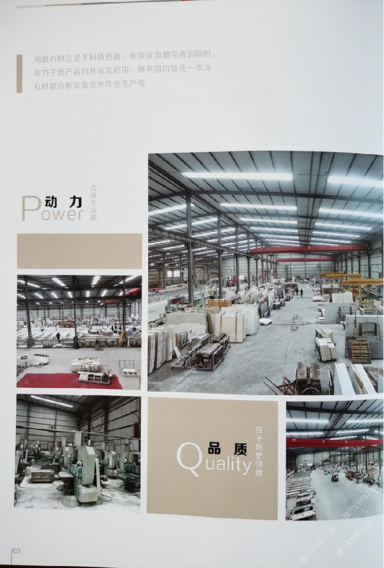 閩晨公司2016年成立于世界石都,中國(guó)石材集散地,福建南安水頭鎮(zhèn),占地面積2萬(wàn)余平方米?,F(xiàn)有技術(shù)管理人員和技工隊(duì)伍150多人,經(jīng)過閩晨人的艱苦創(chuàng)業(yè)和與九天龍公司的強(qiáng)強(qiáng)聯(lián)合,現(xiàn)已發(fā)展成為國(guó)內(nèi)鋁蜂窩復(fù)合石材、節(jié)能保溫復(fù)合石材具有影響力和創(chuàng)新研發(fā)實(shí)力的集石材深加工、專業(yè)承包、石材深化設(shè)計(jì),節(jié)能保溫石材研發(fā)技術(shù)咨詢服務(wù)為一體的新型綜合性大型石材工程加工企業(yè)。 閩晨公司規(guī)模宏大。年產(chǎn)鋁蜂窩復(fù)合石材、保溫復(fù)合石材、瓷磚復(fù)合石材、透光復(fù)合石材、石線和傳統(tǒng)平板石材50萬(wàn)平方米。公司2018年與九天龍公司融股聯(lián)合,生產(chǎn)保溫石材復(fù)合板,給公司輸入了新的動(dòng)能和產(chǎn)能,增強(qiáng)了公司新的技術(shù)含量,把公司的業(yè)務(wù)與影響擴(kuò)展到祖國(guó)的大江南北,招引了大量北方客戶,在激烈的行業(yè)競(jìng)爭(zhēng)中公司以超前創(chuàng)新的技術(shù),優(yōu)良人性化的服務(wù),質(zhì)優(yōu)價(jià)美的產(chǎn)品,疑難技術(shù)的解惑和售后服務(wù)贏得了客戶的好評(píng)與信賴。 閩晨公司技術(shù)力量雄厚。為了滿足國(guó)內(nèi)外建筑石材裝飾工程不同工藝加工需求。公司先后從國(guó)內(nèi)外采購(gòu)了走在前線的流水線加工設(shè)備,其主要有復(fù)合板自動(dòng)磨流水線、烘干流水線、自動(dòng)定厚機(jī)、自動(dòng)線條流水線、紅外線切邊機(jī)、自動(dòng)倒邊機(jī)、自動(dòng)磨光機(jī)、自動(dòng)涂膠機(jī)、自動(dòng)磨邊機(jī)、自動(dòng)清洗防護(hù)流水線,電腦數(shù)控技術(shù)等各種復(fù)合異型石材加工設(shè)備。公司擁有一班開拓型高素質(zhì)管理人才隊(duì)伍和一大批精通專業(yè)技術(shù)工人,公司建立了完善的質(zhì)量管理體系,確保公司加工生產(chǎn)經(jīng)營(yíng)有序與規(guī)模,為承攬大型鋁蜂窩復(fù)合石材、節(jié)能保溫石材和各類異型建筑裝飾石材工程提供了可靠的品質(zhì)保證。 閩晨人一諾千金:正以前沿的復(fù)合石材產(chǎn)品,合理的價(jià)位,優(yōu)化的設(shè)計(jì)方案,較好的服務(wù)和一如既往的誠(chéng)實(shí)守信與新老客戶共筑石業(yè)新輝煌。