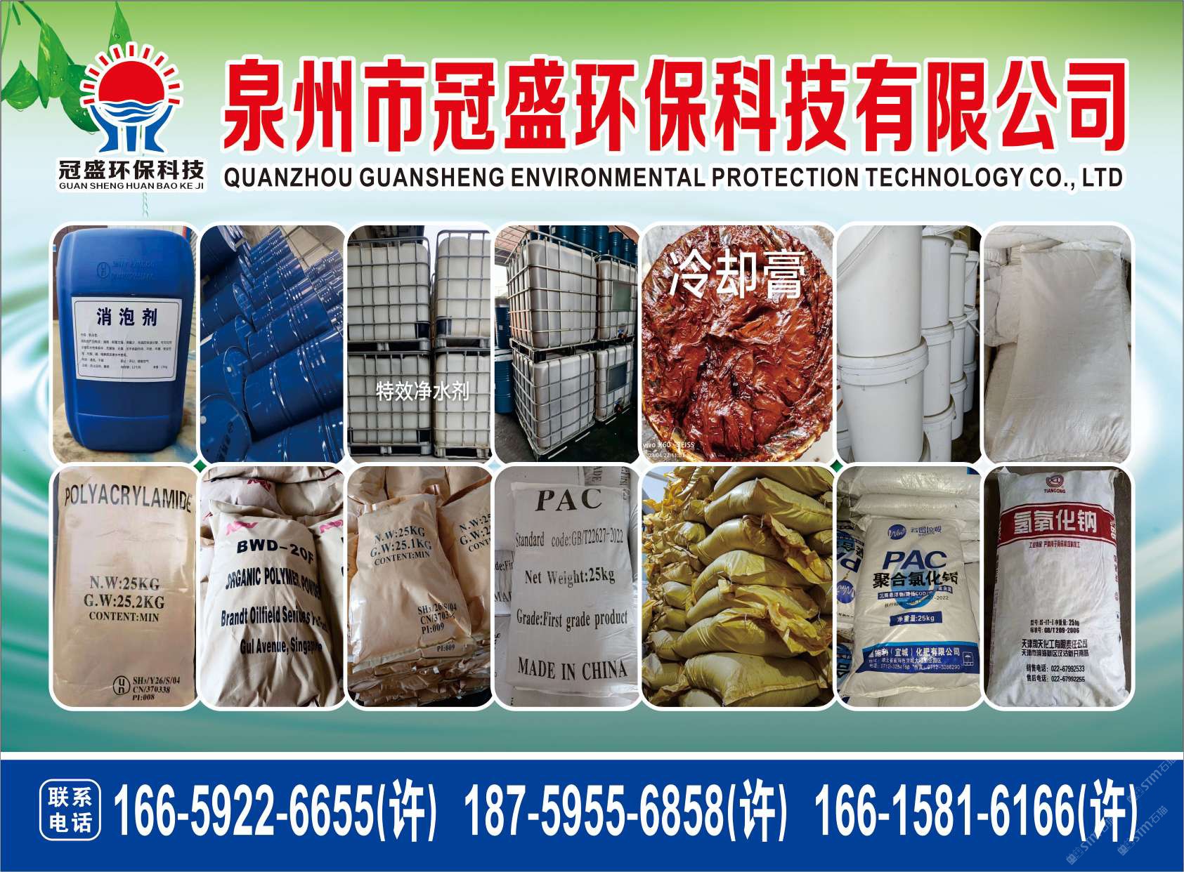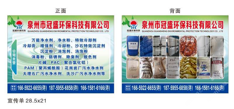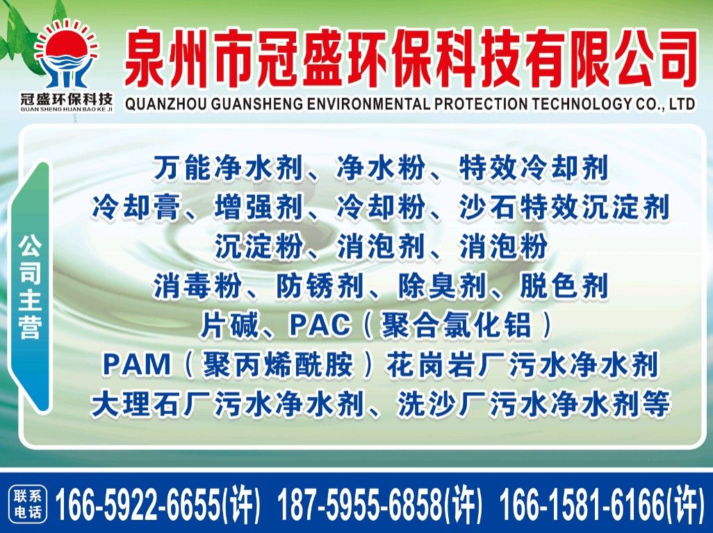 主營(yíng)產(chǎn)品:凈水劑,冷卻劑,冷卻粉,大理石人造石專用凈水劑,沉淀粉,消泡劑,消毒凈水劑,防銹凈水劑,除銹劑,除臭劑,聚丙烯酰胺,聚合氯化鋁,鹵精,洗沙專用凈水劑,壓濾機(jī)專用凈水劑,陶瓷廠專用凈水劑(黃藥 白藥)等所有水處理環(huán)保材料……