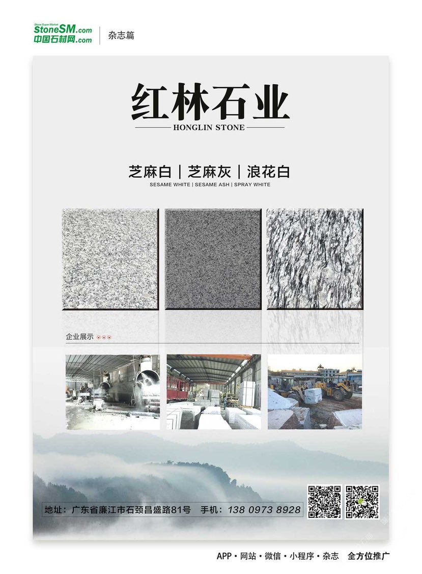 紅林石材廠位于廣東省廉江市石材工業(yè)園區(qū),擁用大型礦山資源,主要出產(chǎn)國(guó)內(nèi)知名品種如工:芝麻白、海浪花、芝麻灰,楓葉紅等花崗巖石材,我廠主要做各種規(guī)格臺(tái)板、地板磚、荒料石、石材加工、風(fēng)景石、園林石、觀賞石、招牌石、門牌石、陽(yáng)臺(tái)花瓶、欄桿、風(fēng)水球、石桌石凳等工藝加工及別墅精裝設(shè)計(jì)。另外可根據(jù)用戶需要進(jìn)行各種異形材加工,產(chǎn)品銷往全國(guó)各地。本廠具有長(zhǎng)期加工經(jīng)驗(yàn),質(zhì)量可靠。公司秉承“以誠(chéng)信為根本,以質(zhì)量為生存”的經(jīng)營(yíng)理念,堅(jiān)持“客戶、互惠互利”的原則為廣大客戶提供優(yōu)質(zhì)的服務(wù)。歡迎廣大的新老用戶,前來(lái)洽談合作!