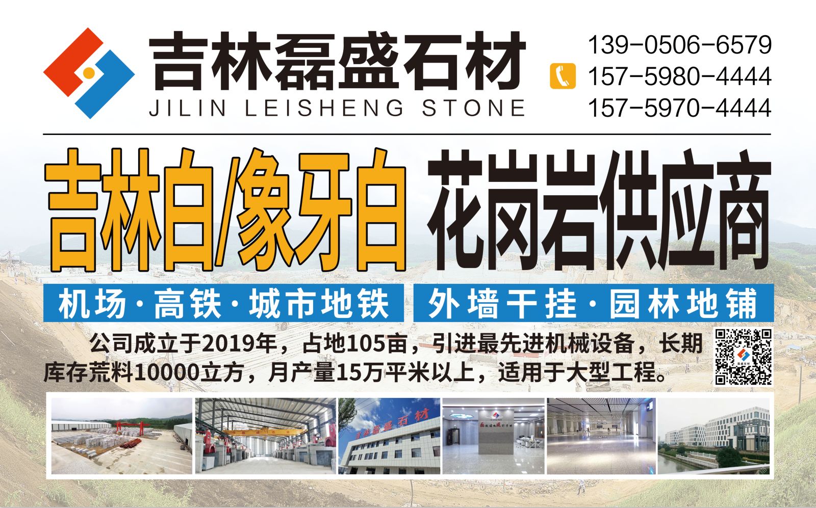 吉林磊盛石材有限公司成立于2019年占地105畝,引進(jìn)進(jìn)機(jī)械設(shè)備,月產(chǎn)吉林白(象牙白)20萬平方。長(zhǎng)期庫(kù)存荒料10000立方 ,適用工程:(機(jī)場(chǎng),高鐵,城市地鐵,外墻干掛,園林地鋪)