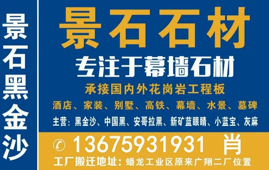 便宜黑金沙-景石石材肖總13675931931(微信同號)專業(yè)黑金沙-安格拉黑-藍珍珠-綠星-藍鉆-藍眼睛-銀珠花崗巖供應(yīng)商,工廠位于南安水頭,配有八臺大切,4臺紅外線,6臺仿形機等設(shè)備;生產(chǎn)能力強,管理規(guī)范,有實力承接中大型幕墻及園林景觀工程;追求更好的產(chǎn)品質(zhì)量是我們對客戶的宗旨;主營:印度黑金沙、安格拉黑、安哥拉黑、藍珍珠、銀珠、綠星、藍鉆、藍眼睛等石材;專注于幕墻干掛與水景工程,實力工廠,價格優(yōu)惠,真誠希望您的光臨與合作!