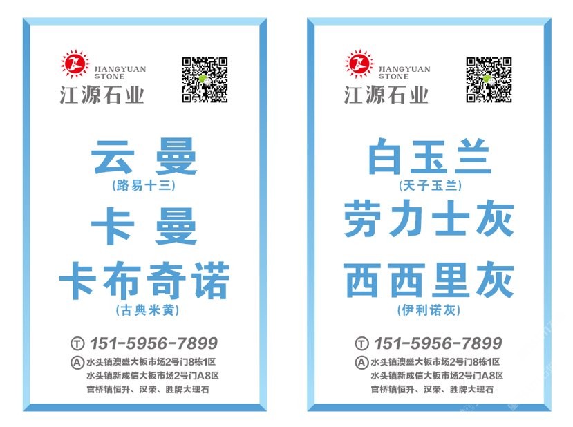 銷售點(diǎn):澳盛大板市場2號門8棟1-4區(qū),新成信2號門A8-10區(qū),官橋恒升、勝牌大理石廠