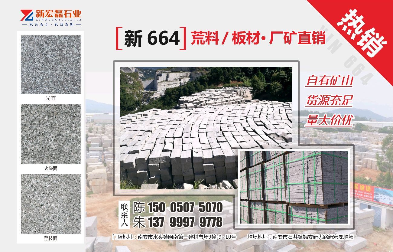 發(fā)布信息: 新664 荒料礦山直銷 ,量大價優(yōu)!15005075070陳 13799929778 朱 門店地址:南安市水頭鎮(zhèn)閩南建材市場9幢-9~10號 堆場地址:南安市石井鎮(zhèn)錦安新大路新宏磊堆場
