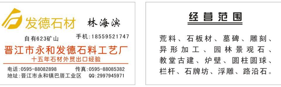 晉江市永和發(fā)德石料工藝廠 聯(lián)系人:林海濱    185****1747 查看 0595-****2898 查看 主營范圍: 異型加工、石材雕刻、環(huán)境石材、石材工藝品、碑石加工、 企業(yè)地址:福建晉江永和鎮(zhèn)巴厝村發(fā)德石料工藝廠