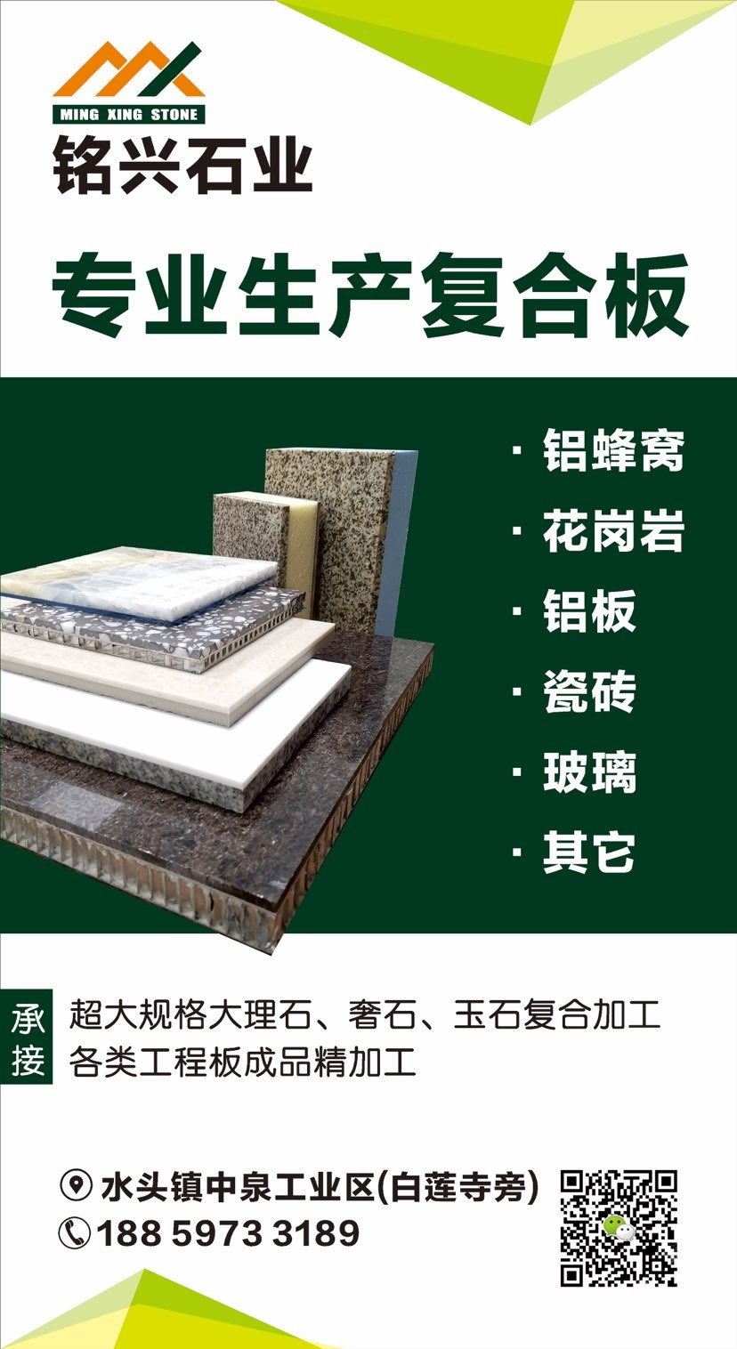 發(fā)布信息: 【銘興復(fù)合板】專業(yè)加工各類石材復(fù)合板 1.承接大理石/花崗巖復(fù)合板工程、幕墻! (鋁蜂窩板、花崗巖、瓷磚,玻纖蜂窩板,人造石、玻璃等) 2.各類超大規(guī)格石材復(fù)合板(3800×2100) 供應(yīng)各類石材復(fù)合板成品,來料代加工!