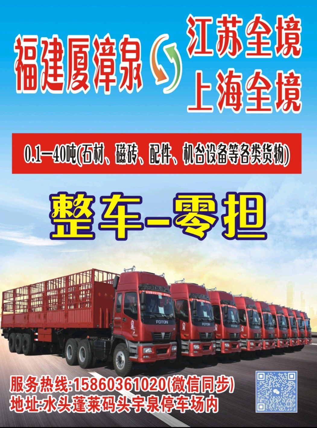 發(fā)布信息: 專業(yè)承接,廈漳泉~江蘇,浙江,上海大小貨物運(yùn)輸! [玫瑰][玫瑰][玫瑰]蘇州,無錫,常州,宜興……衢州,麗水,金華,永康,杭州~上海! 接收—整車—零擔(dān)—運(yùn)輸, 零擔(dān)可小車上門接送, 做專業(yè)的運(yùn)輸服務(wù), 本車隊(duì)均有4.2米,9.6米,13米,15米,16米,17.5米車輛, 服務(wù)熱線:15860361020