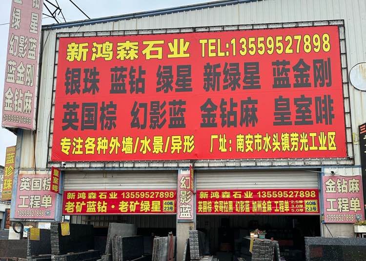 新鴻森石業(yè) 聯(lián)系人:李先生    135****7898 查看 135****7898 查看 主營范圍: 大板批發(fā)、荒料、花崗巖加工、 企業(yè)地址:福建南安建材市場40棟23號