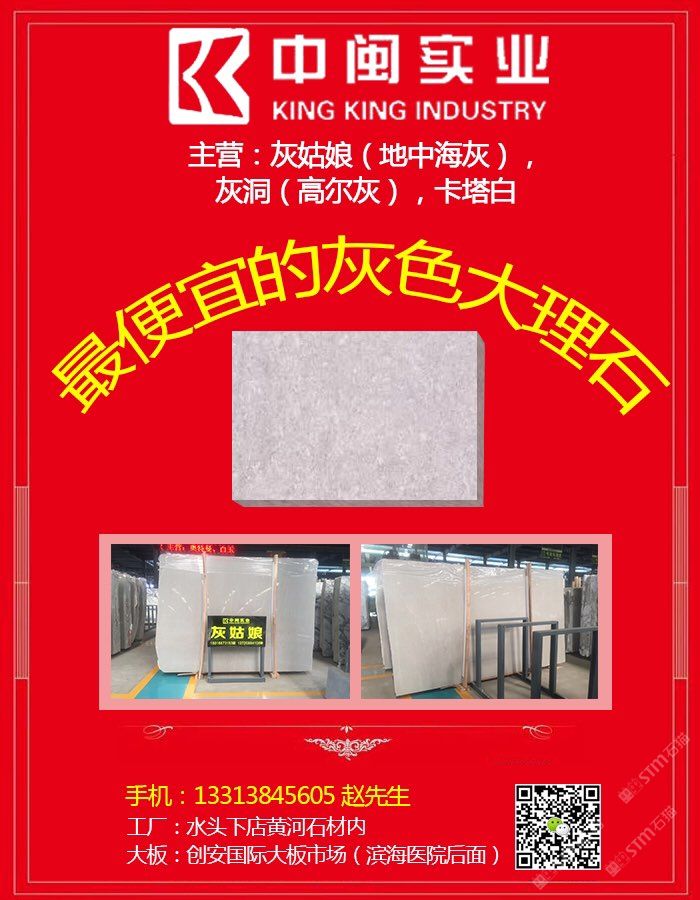 發(fā)布信息: 中閩實(shí)業(yè)成立于2012年,經(jīng)過幾年發(fā)展,已經(jīng)成為礦山開采,大板銷售,工程板(規(guī)格板)加工銷售,一條龍的石材企業(yè),公司致力于成為國內(nèi)的灰色大理石出口商,同時(shí)大力發(fā)展國內(nèi)業(yè)務(wù),主營品種:灰姑娘,高爾灰(灰洞),不管是荒料,大板還是成品,也不論是磨光面,還是啞光,噴砂,酸洗,鋼刷,拉絲,皮革,滾磨,只要是灰姑娘和高爾灰,1.8還是3公分亦或者是其他厚度,反正找我們沒錯(cuò),公司自有加工廠(只加工自己的訂單),趕進(jìn)度的,不趕進(jìn)度的,通通可以滿足.13313845605趙先生,創(chuàng)安國際大板市場E3區(qū),工廠:水頭下店黃河石材內(nèi)