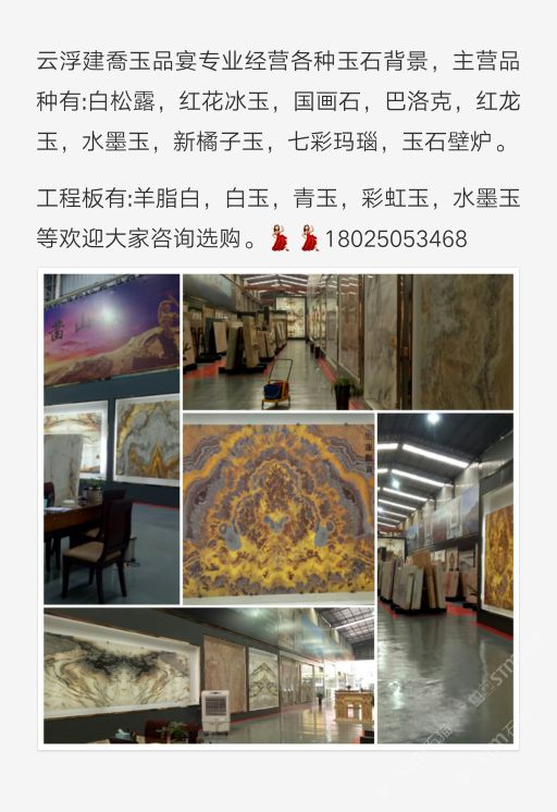云浮建喬玉品宴 聯(lián)系人:劉小姐    180****9248 查看 手機號碼:無 主營范圍: 石材工藝品、大板批發(fā)、 企業(yè)地址:廣東云浮云浮市324國道加德士加油站往廣州方向500米