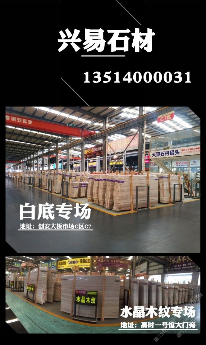 發(fā)布信息: ? ? ? 【興易大理石】 ? ? 白底水晶木紋專場(chǎng) ? 我司主營(yíng)水晶木紋系列產(chǎn)品: 水晶木紋,翡翠木紋,國(guó)產(chǎn)藍(lán)金沙,白金沙,彩虹木紋 ? 滿倉(cāng)白底水晶木紋新料任選, 條板,大板 荒料均有售,統(tǒng)一花色,防水背膠供應(yīng)! 部分礦口特惠,歡迎撿漏 歡迎新老客戶來(lái)電垂詢! ? ?地址: ? 濱海高時(shí)物流一號(hào)館大門旁 ? 創(chuàng)安c區(qū)c7區(qū)興易石材 ? 電話:13514000031小李 ? ?