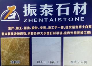 北京振泰石材主營產(chǎn)品:爵士白,西班牙米黃,新雅士白,新西米,奧特曼(人造石),白雪晶(人造石),珊瑚海,珊瑚海1,貴族米黃,香妃玉蘭,香妃米黃2,拉菲紅,皇家白玉,紅龍玉8,山水畫1,皇家閃電,藍(lán)木紋5,云多拉灰12,云多拉灰13企業(yè)地址:河北廊坊香河石材城A0801、A0803